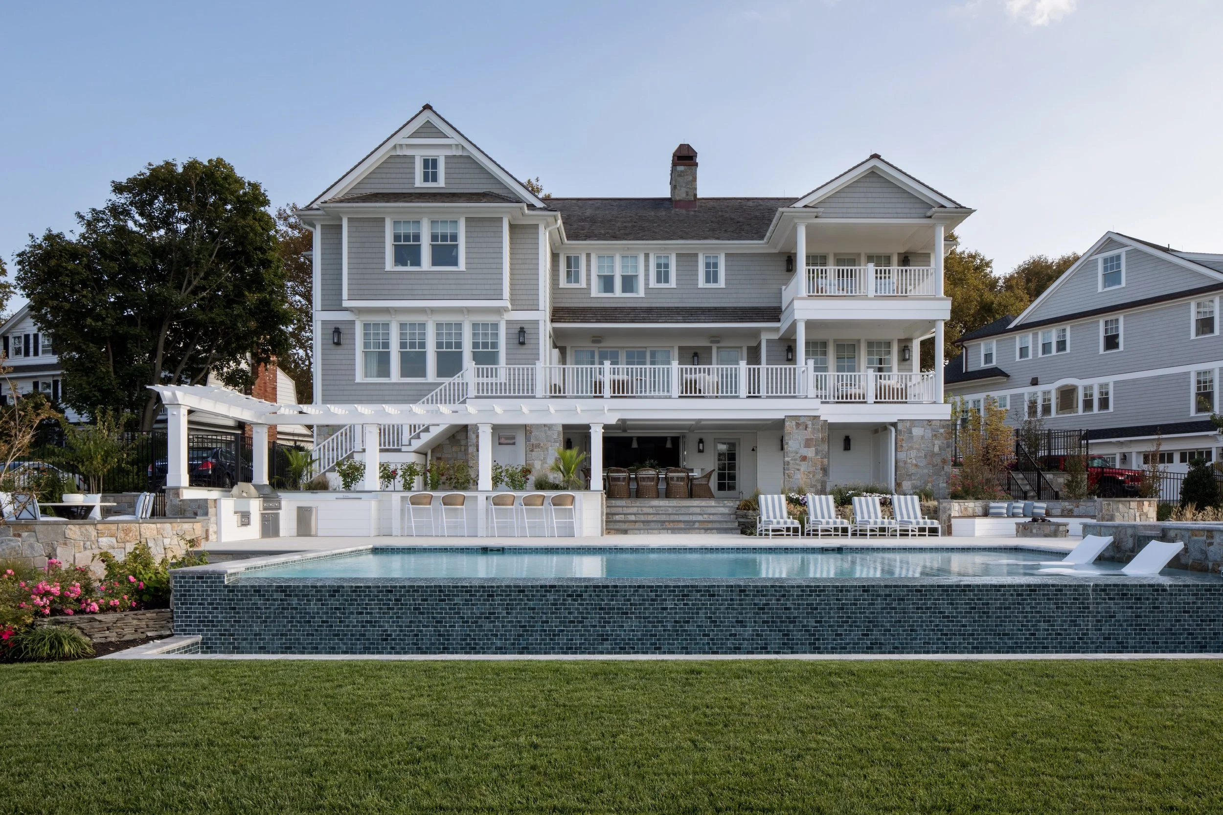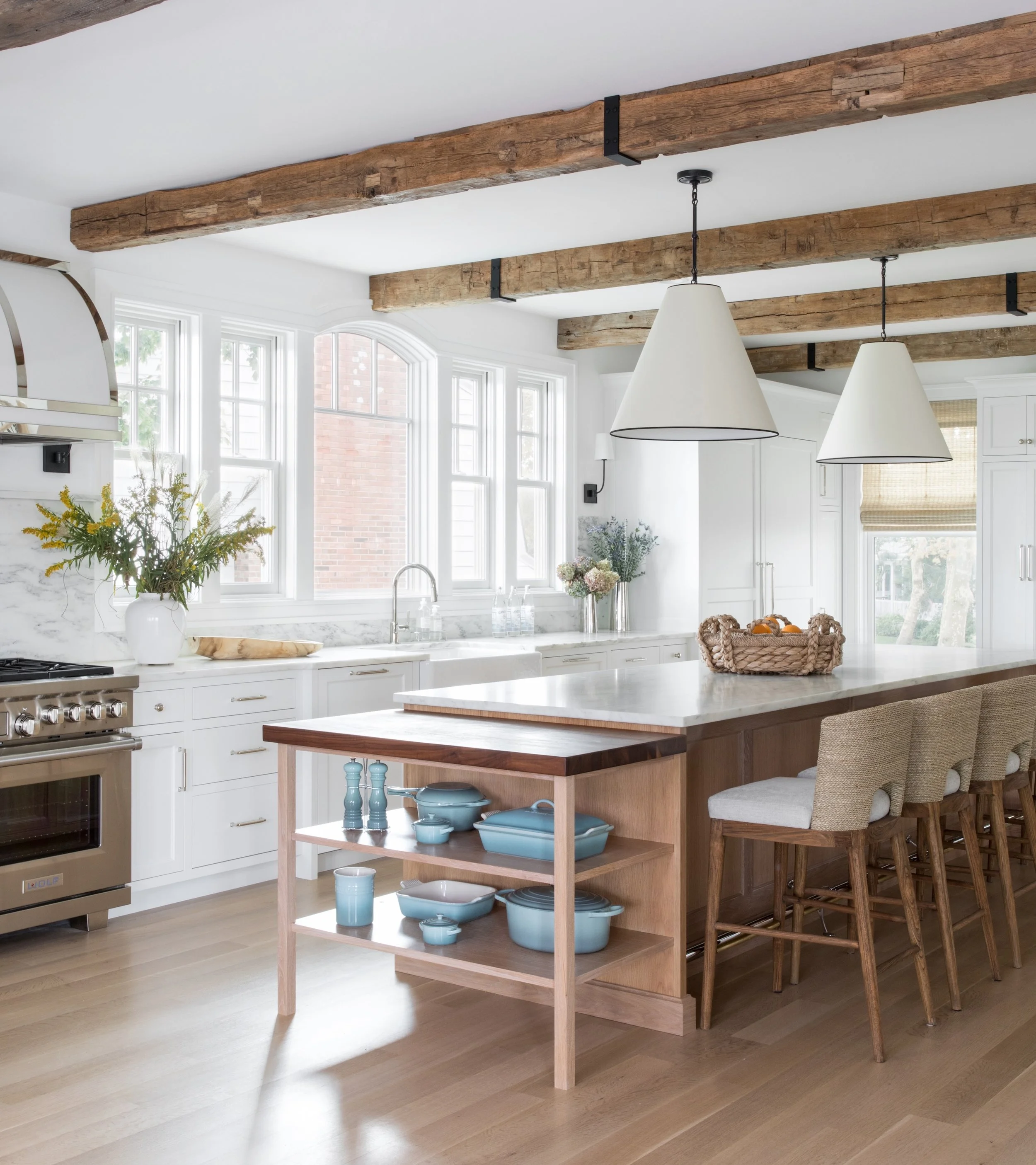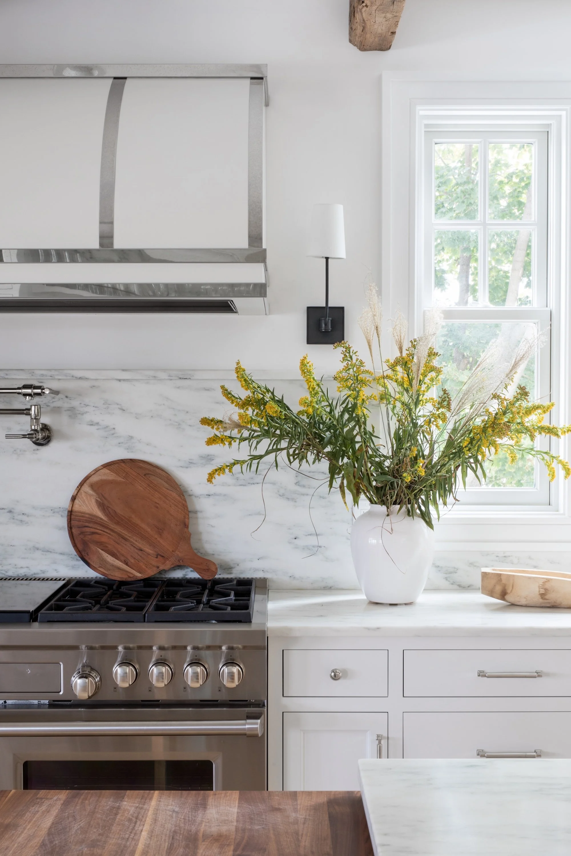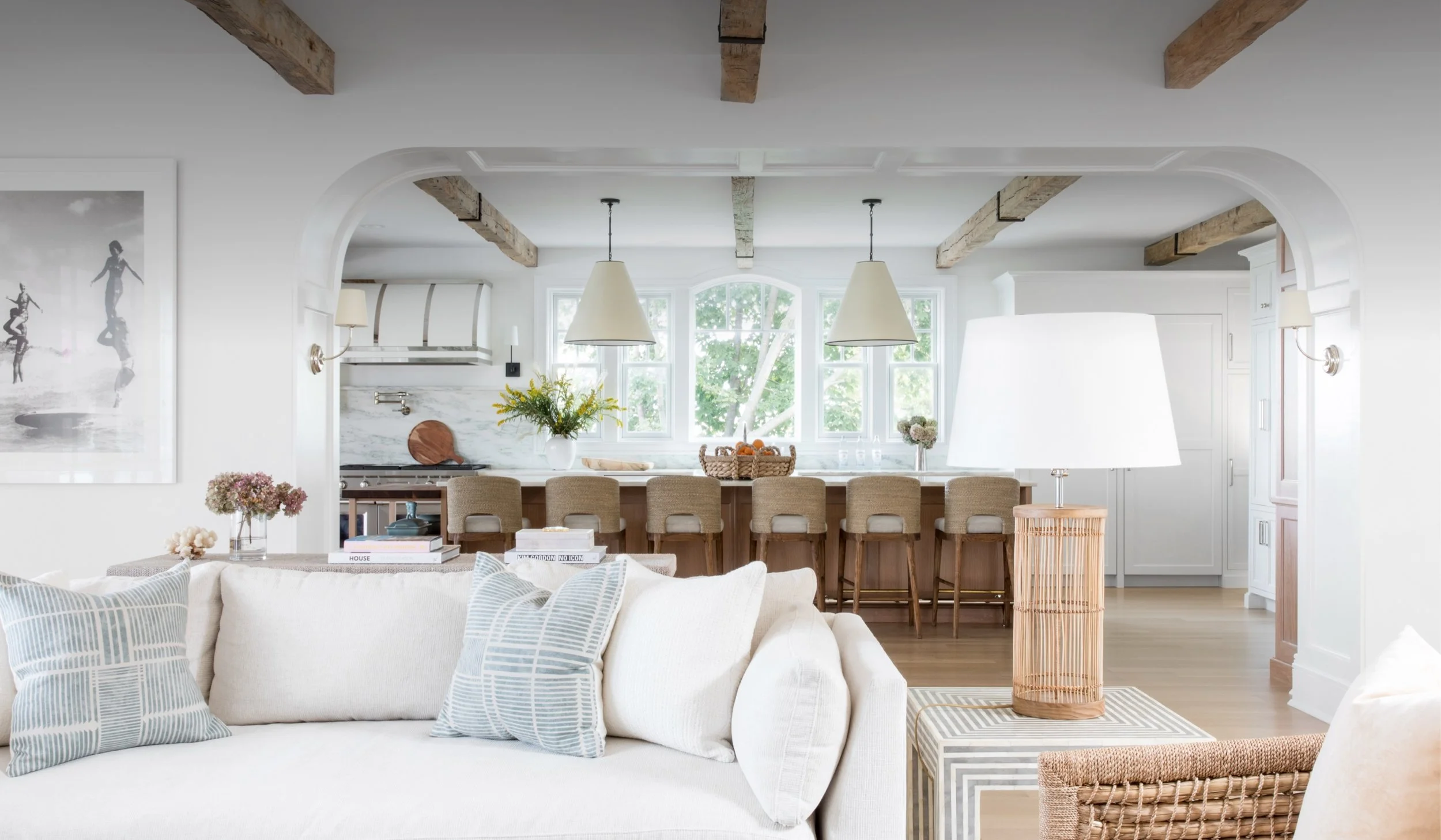 Timeless details wash over this forever beach home, perched on the Shark River Inlet in Belmar, New Jersey. A classic marble fireplace, elegant arches, and rustic ceiling beams lend a sense of permanence that reads soft-modern instead of overly coastal. Throughout, whitewashed pine ceilings, Italian Murano glass petal chandeliers and vintage photography—including pieces by Slim Aarons—keep the aesthetic fresh yet nostalgic. And, in a moment of sophisticated play, a ping pong-inspired dining table invites gathering for the large family that lives here and loves to entertain.