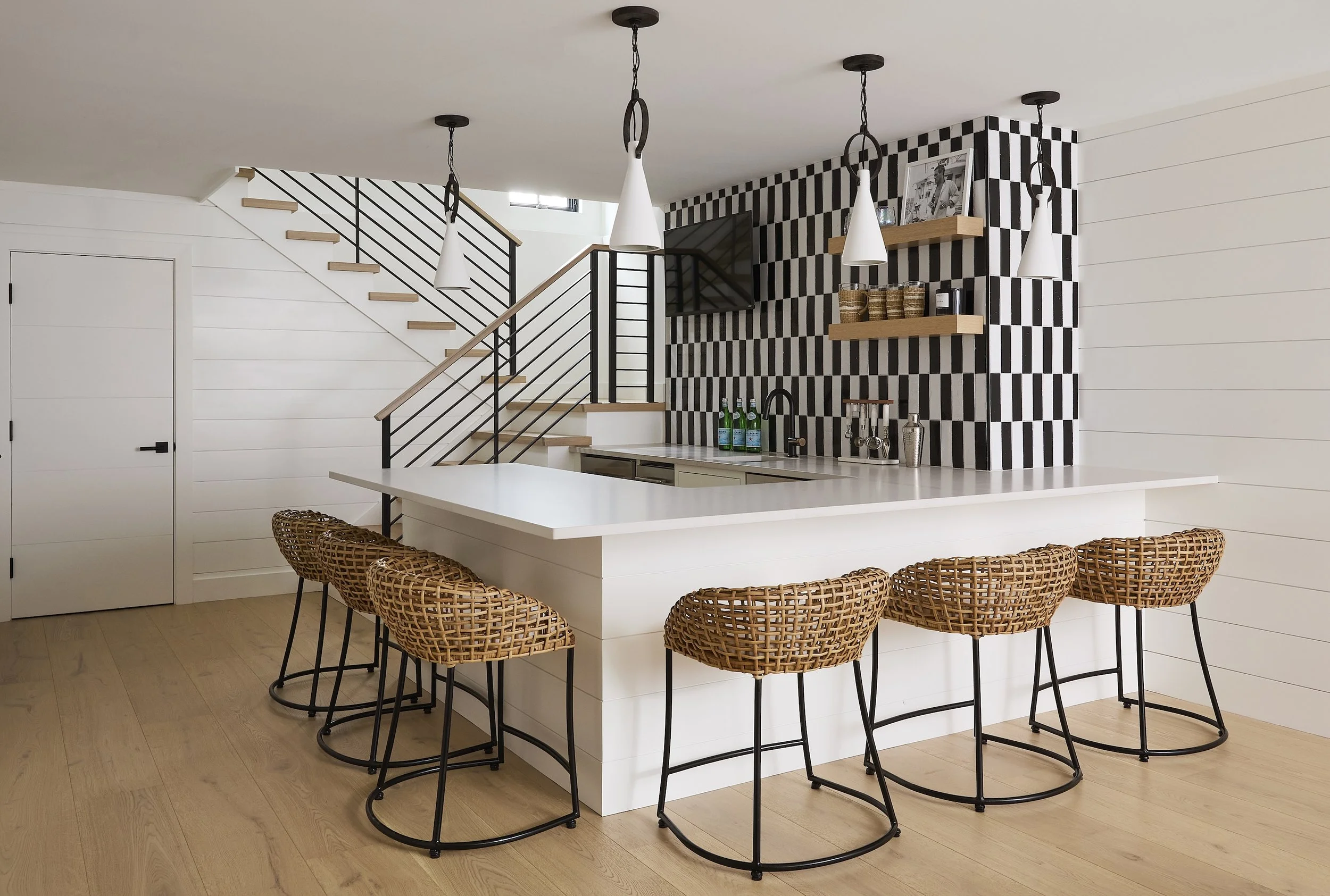 In stark contrast to the juicy-hued creations at health food concept The Playa Bowls, we created a black-and-white palette for the family home and cabana belonging to the company’s founder, who sought a chicly modern scheme with a touch of edge. We had fun exploring patterns, colors, and shapes through tiles, photography, and various materials, including woven pendants from Indonesia that nod to her love of travel, and black-and-white tiles that edge the waterline of the pool. A long table in the Japanese Zen-like dining room shifts between dinner parties, art projects and sessions spent learning to tattoo.